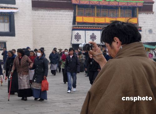 2月25日是藏歷土牛年正月初一,在布達拉宮、大昭寺等拉薩景點,藏族人民正在用手機、數(shù)碼相機、DV等現(xiàn)代數(shù)碼產品通信、拍攝和錄制照片。中新社發(fā) 龍昊 攝