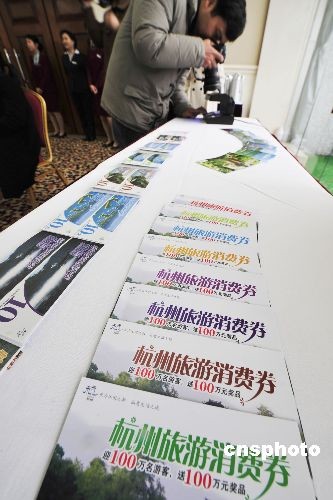 2月26日,杭州市宣布“杭州旅游消費(fèi)券”發(fā)放及使用說明,并開始正式面向以長(zhǎng)三角地區(qū)為重點(diǎn)的國(guó)內(nèi)及港澳臺(tái)旅游市場(chǎng)免費(fèi)發(fā)放240萬份總面值為1.5億元的“杭州旅游消費(fèi)券”,從2009年3月1日起至5月31日止,持券游客來杭旅游可在指定商家使用并享受相應(yīng)的優(yōu)惠。 中新社發(fā) 李忠 攝