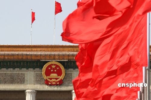 2009年3月1日,“兩會(huì)”即將召開(kāi),北京天安門(mén)廣場(chǎng)及周邊建筑掛起了紅旗,廣場(chǎng)上一片喜慶祥和氣氛。中新社發(fā) 魯谷 攝