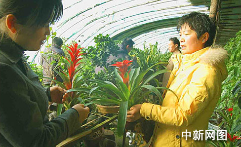 3月4日,甘肅省玉門市境內的日光溫室花卉棚里,市民選購絢麗多彩的鮮花,用來裝點居室,或走親訪友。玉門市位于甘肅省西端,隨著天氣轉暖,這里的日光溫室里,各種鮮花爭相開放。方圓 攝