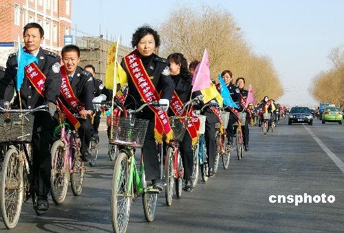 3月6日,甘肅張掖各界婦女代表近千人參加“保護(hù)濕地”環(huán)境保護(hù)主題宣傳日活動(dòng)。圖為婦女自行車隊(duì)沿街宣傳。 中新社發(fā) 羅易祥 攝