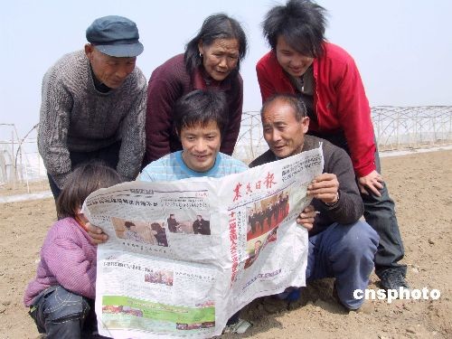 3月9日,山東省棗莊市山亭區(qū)店子鎮(zhèn)返鄉(xiāng)農(nóng)民工張士軍(右二)在農(nóng)活空閑時(shí)間和村民們一起在地頭學(xué)習(xí)溫家寶總理作的《政府工作報(bào)告》。連日來,棗莊市山亭區(qū)人民通過電視、電腦、報(bào)紙等媒體搜索溫家寶總理作的《政府工作報(bào)告》,在山亭區(qū)形成一種學(xué)習(xí)熱。中新社發(fā) 王啟蒙 攝