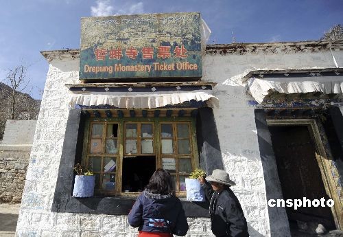 3月10日,游人在西藏拉薩哲蚌寺售票處購買參觀票。當(dāng)日,哲蚌寺推出半價門票。中新社發(fā) 廖攀 攝