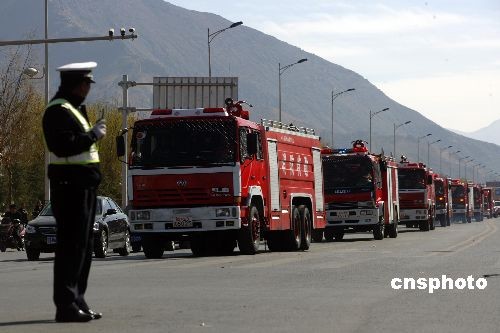 3月10日,西藏公安消防部隊(duì)特種裝備車輛亮相拉薩街頭,26輛特種消防車輛在市區(qū)的主要街道進(jìn)行拉動(dòng)演練。中新社發(fā) 劉震 攝