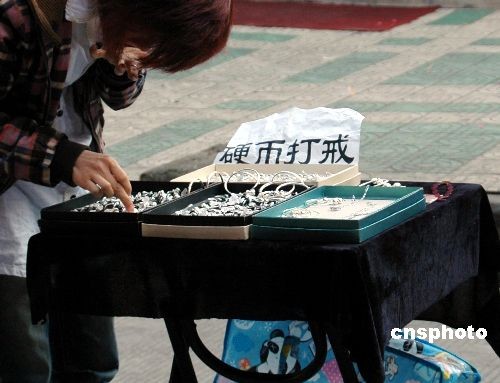 3月11日,在浙江溫嶺街頭,有人擺地攤叫賣“硬幣打戒”,地攤上寫著廣告。據(jù)女攤主稱,每枚戒指都是由一枚1元面值硬幣打成的。據(jù)了解,硬幣打戒指屬違法行為,《中華人民共和國人民幣管理條例》第二十七條第一款明確規(guī)定,“禁止故意毀損人民幣”;第四十三條指出,“故意毀損人民幣的,由公安機關(guān)給予警告,并處1萬元以下的罰款。中新社發(fā) 江勇兵 攝