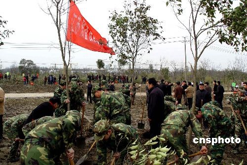 3月11日上午,植樹節(jié)即將到來之際, 江蘇省揚州市開展全民義務植樹活動。江蘇某預備役高炮師組織官兵到駐地參加義務植樹。圖為官兵在同當地市民共同種下白玉蘭樹。中新社發(fā) 田亞威 攝