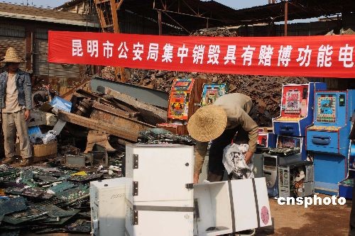 三月十三日,昆明市公安局集中銷毀賭博性游戲機(jī)及電路板共1560件,價(jià)值上百萬(wàn)元人民幣。這種賭博游戲機(jī)通過(guò)無(wú)線收發(fā)器來(lái)控制內(nèi)部的電腦,達(dá)到操縱賭博結(jié)果的目的。圖為被銷毀的賭博游戲機(jī)。中新社發(fā) 劉冉陽(yáng) 攝