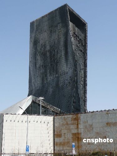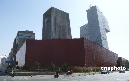 2009年3月13日,經(jīng)過半個多月的施工,北京央視新樓北配樓火災(zāi)現(xiàn)場旁的廣告牌搭建完畢,廣告牌已將央視北配樓部分樓體遮擋起來。中新社發(fā) 玉龍 攝