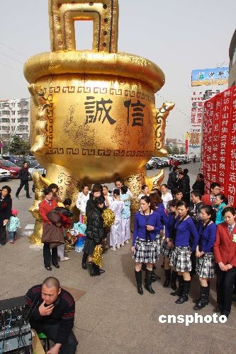 3月15日,山東濰坊市區(qū)的一處“3.15”宣傳站點兩側(cè)分別設置了高7米、寬5米的巨型充氣“誠信金鼎”。中新社發(fā) 孫樹寶 攝