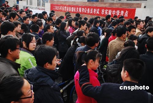 3月15日,參加山東公務(wù)員考試的考生們?cè)谏綎|東營(yíng)市實(shí)驗(yàn)中學(xué)考點(diǎn)等待進(jìn)入考場(chǎng)。當(dāng)日,2009年度山東公務(wù)員考試公共科目筆試在全省同時(shí)舉行,共有39萬多人參加考試,競(jìng)爭(zhēng)8685個(gè)崗位。中新社發(fā) 李波 攝