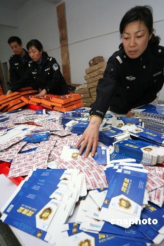 3月18日,河南許昌市魏都公安分局民警在涉嫌制造假藥窩點統(tǒng)計查獲的假藥及藥品標簽、藥盒等。當日,魏都警方接群眾舉報,在一閑置廠房內(nèi)查獲涉嫌制造假藥窩點,當場查扣涉嫌假冒藥品10多種,半成品藥品、包裝箱、合格證、防偽標識等1000多件,涉案值達2000余萬元。假冒藥品有五豆平糖膠囊、腎金子、腎黃金、協(xié)和降脂等10多種,藥效包含降壓、減肥、壯陽滋補等。藥品的制假技術(shù)很高,須借助儀器檢測才能區(qū)別。此案正在進一步調(diào)查處理中。中新社發(fā) 牛書培 攝