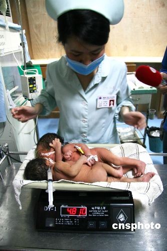 三月十九日,湖南省兒童醫(yī)院對(duì)剛剛轉(zhuǎn)診到醫(yī)院的一對(duì)連體女嬰進(jìn)行詳細(xì)全身檢查,初步診斷為對(duì)稱性劍-臍連體女嬰,胸骨下端與臍部腹壁相連、共肝,病情危重。十六日八時(shí)許,二十八歲的段曉艷在湖南婁底新化縣中醫(yī)院婦產(chǎn)科剖腹分娩出這對(duì)連體女嬰,體重四點(diǎn)八公斤。中新社發(fā) 李奇 攝