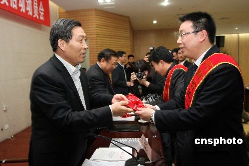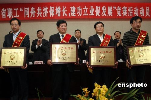 2009年3月19日,“河南省五一勞動獎”表彰大會在鄭州舉行,52個集體獲得“河南省五一勞動獎狀”,121名先進(jìn)個人獲得“河南省五一勞動獎?wù)隆。河南省副省長史濟(jì)春為獲表彰人員頒獎。中新社發(fā) 陳代述 攝