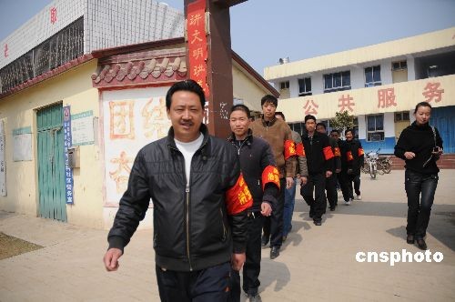 3月25日,兩支主要由返鄉(xiāng)農(nóng)民工和大學(xué)生村官組成的治安巡邏隊(duì)奔赴河南省南陽(yáng)市臥龍區(qū)武候街道的城鄉(xiāng)“戰(zhàn)場(chǎng)”。去年以來(lái),武候街道共吸納150名返鄉(xiāng)農(nóng)民工和大學(xué)生村官,組成城鄉(xiāng)治安巡邏隊(duì),對(duì)城市社區(qū)和農(nóng)村鄉(xiāng)鎮(zhèn)實(shí)行24小時(shí)不間斷治安巡邏。巡邏隊(duì)員每人每月可獲得300元的崗位補(bǔ)助,而且,周六、周日和節(jié)假日還可享用二至三倍的加班費(fèi)。 中新社發(fā) 付海厚 攝