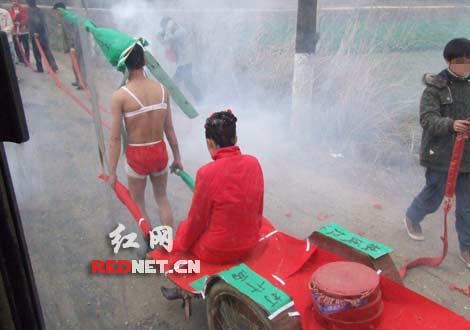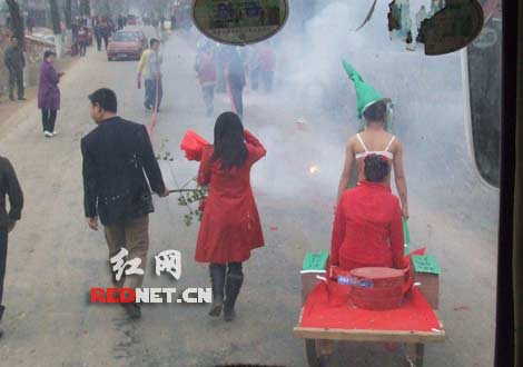 25日上午,網(wǎng)友“鍋爐工”在紅網(wǎng)論壇發(fā)帖,再現(xiàn)了一場(chǎng)“雷人”婚禮,帖子描述道“這男人扮牛頭,拉個(gè)‘投胎轉(zhuǎn)世車(chē)’拖著老婆回家,新娘后面放著幾掛鞭炮,據(jù)說(shuō)是驅(qū)鬼用,拉著上‘奈何橋’好恐怖啊!”