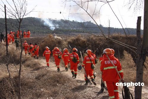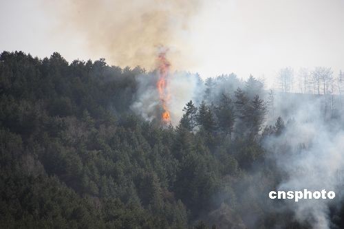 2009年3月28日下午2時左右,山西省盂縣東梁鄉(xiāng)東梁村騎龍山發(fā)生森林火災。 森林火災發(fā)生后,當?shù)卣⒐、林業(yè)、醫(yī)務等部門第一時間趕到現(xiàn)場,組織滅火,并啟動了相關應急預案。當?shù)爻鰟訑?shù)百名干部群眾撲火,陽泉市武警也趕赴現(xiàn)場增援。由于火勢兇猛,在附近的村莊都能聽到火燒山林的聲音,山火的灰塵甚至飄到了最近的溫家山村。截至發(fā)稿時,沒有人員傷亡報告。中新社發(fā) 程瑜 攝
