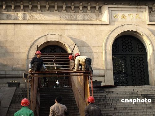 據(jù)南京市中山陵園管理局消息,為迎接孫中山奉安大典80周年,南京市近日投資300多萬元啟動中山陵主體建筑維修工程。據(jù)了解,這也是自新中國成立近60年來,中山陵第二次大規(guī)模維修,上次規(guī)模較大的維修是在1982年。“吾死之后,可葬于紫金山麓,因南京為臨時政府所在地,所以不忘辛亥革命也!弊裾諏O中山先生的遺愿,中山陵于1926年春開始修建,至1929年建成,當(dāng)年6月1日,中山先生的靈柩奉安于此。 中新社發(fā) 楊潔 攝