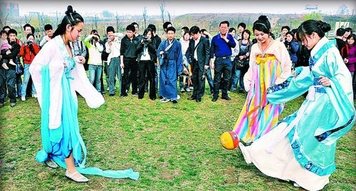 3月29日,農(nóng)歷三月三上巳節(jié),是中國傳統(tǒng)的“女兒節(jié)”。西安一群愛好漢服的女子來到唐城墻遺址公園的吟詩壇里秀風(fēng)采。幾個女孩子以古代名畫《女史箴圖》為藍(lán)本,以情景劇形式表現(xiàn)中國古代貴婦的妝容文化。旁邊還配有專業(yè)人士指導(dǎo)并現(xiàn)場解說,向大家介紹中國古代婦女的妝容。隨后,她們又到曲江池遺址公園湖邊,舉行祓禊祈;顒,并踢起了球。