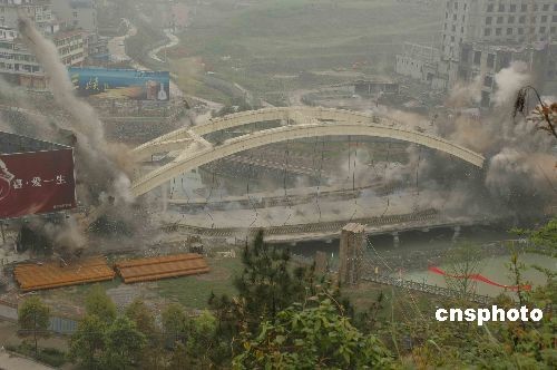 4月5日,在“5.12”汶川大地震中損壞的重慶市黔江區(qū)黔州大橋被成功爆破。黔州大橋于1997年建成,去年“5.12”汶川大地震后,大橋的拱肋、橋面及橋墩等多處出現(xiàn)裂痕,吊桿松動嚴(yán)重,當(dāng)?shù)卣扇∠薷叩刃问浇箍拓涊d重車通行,并進(jìn)行監(jiān)測。2009年初,經(jīng)專家勘測、檢驗,決定拆除該橋。中新社發(fā) 阮守軍 攝