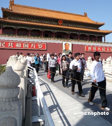 2009年4月6日,北京天安門金水橋第一階段修繕工程結(jié)束,東二橋和西二橋的青磚橋面已鋪上地毯供游人臨時(shí)通過。據(jù)悉,下一階段將在橋上架設(shè)棧道,棧道將滿鋪木板,能夠承受游人活動(dòng)等所產(chǎn)生的荷載強(qiáng)度等。為便于今后金水橋橋面的排水和通風(fēng),新修的棧道將架空于橋面。棧道與橋面支撐處采取彈性相接,并選擇橋面范圍以外的地方進(jìn)行固定。中新社發(fā) 玉龍 攝