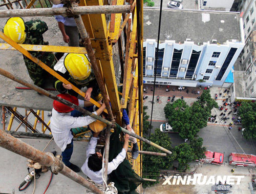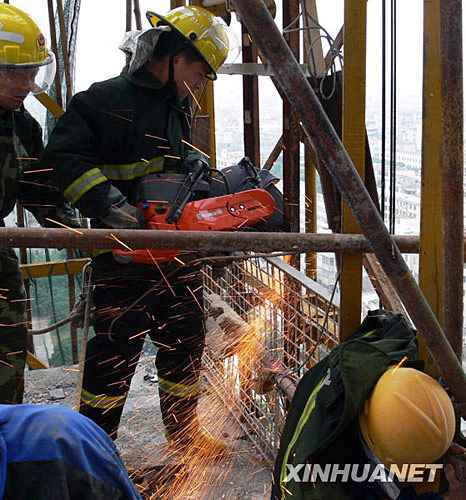 4月11日,在廣西北海市深圳路一個(gè)施工工地,消防官兵正在營救被困工人,被困者身穿藍(lán)衣,手腳被升降機(jī)吊架卡住。當(dāng)日上午,在廣西北海市深圳路一個(gè)施工工地,一名工人不慎被升降機(jī)吊架卡住困在19樓。北海市消防支隊(duì)官兵接到報(bào)警后迅速趕赴現(xiàn)場,用切割機(jī)切斷鋼板,及時(shí)將被困工人救出送往醫(yī)院救治。由于救援及時(shí),該工人無生命危險(xiǎn)。
