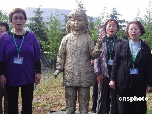 4月18日,由日本和平友好人士倡議并捐資塑造、象征和平的“紫金花女孩”銅像在侵華日軍南京大屠殺遇難同胞紀(jì)念館和平公園內(nèi)落成,該銅像高1.17米,表現(xiàn)的是抗日戰(zhàn)爭(zhēng)時(shí)期一個(gè)7、8歲的南京女孩,站立在周圍開(kāi)滿紫金花的一塊山石上,睜大著雙眼看著那個(gè)戰(zhàn)亂的世界。圖為前來(lái)參加銅像揭幕儀式的日本紫金草訪華團(tuán)一行20多人在銅像旁唱起“和平之歌”。中新社發(fā) 王國(guó)安 攝