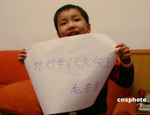 4月25日,北京,毛澤東的曾孫毛東東為中新社5月份在四川舉辦的“洗殤2008——畫冊捐贈儀式及圖片展活動”,以毛主席的“好好學習,天天向上”作為贈言,鼓勵災區(qū)兒童。中國新聞社將在四川省都江堰市舉辦“洗殤2008——畫冊捐贈儀式及圖片展活動”,向災區(qū)學校、圖書館等機構(gòu)捐贈由中新社出版的《2008·鳥巢——華文傳媒關于北京奧運的影像記憶》和《四海同心——全球華僑華人支持中國抗震救災紀實》。希望能以微薄之力安慰在災難中痛失親人的同胞,幫助他們在重建家園的同時,重新構(gòu)建起心靈家園。捐贈儀式及圖片展覽活動期間,中新社將向參觀者及災區(qū)民眾贈送印有精美圖片的心語卡片。中新社發(fā) 于正 攝