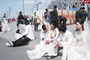 這11對(duì)新人的攝影師姚先生介紹,他們來(lái)自天津薊縣,11對(duì)新人均為影樓顧客。為了在鳥巢、水立方前留下結(jié)婚紀(jì)念,這11對(duì)新人專程組團(tuán)來(lái)到奧林匹克公園。