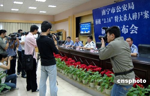 四月三十日,轟動(dòng)廣西首府南寧市的“覃氏三姐妹慘遭碎尸”案宣布告破,南寧市公安局就此舉行新聞發(fā)布會(huì)。二00九年二月十二日,家住南寧市西鄉(xiāng)塘區(qū)的覃女士向公安機(jī)關(guān)報(bào)案,稱其住嘉州華都小區(qū)的三個(gè)妹妹在二月十日晚失蹤。十六日,公安機(jī)關(guān)在南寧郊區(qū)發(fā)現(xiàn)多個(gè)散發(fā)惡臭的袋子,所裝之物為被肢解的尸塊,經(jīng)法醫(yī)鑒定,屬失蹤的三姐妹。南寧市公安局官員在發(fā)布會(huì)上介紹,犯罪嫌疑人蘭某乃三姐妹對(duì)門的鄰居,因工作及感情生活不如意等,欲強(qiáng)奸女性宣泄欲望,事后怕行徑敗露,蘭某遂一一殺死覃氏三姐妹并肢解拋尸郊外荒野。中新社發(fā) 王剛 攝