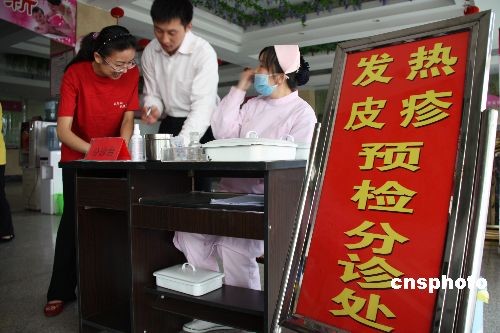 5月4日,山東聊城東昌府區(qū)婦幼保健院分診臺工作人員在對前來就診的患者進(jìn)行預(yù)檢分診。針對當(dāng)前甲型H1N1流感防控形勢的日益嚴(yán)峻,山東聊城市各醫(yī)療機(jī)構(gòu)按照《預(yù)診分診管理辦法》,設(shè)立發(fā)熱門診和預(yù)檢分診處,對不明原因肺炎和流感樣病例進(jìn)行及時監(jiān)測。中新社發(fā) 孔政 攝