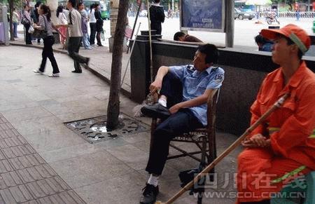 昨日(5日),照片里的主角,宜賓市(四川)翠屏區(qū)市容管理局南城中隊協(xié)管員李劍勇表示,單位領(lǐng)導(dǎo)已批評教育他了,自己影響了宜賓和宜賓城管的形象,他表示非常抱歉!爱敃r所有的攤點都已規(guī)范位置了,想坐著休息下!崩顒τ抡f,城管協(xié)管員沒有固定工作點,他便在游攤最易出現(xiàn)的南門橋頭坐著休息會兒,他希望所有的城管隊員都將他作為反面教材,在以后的工作中注意紀律和形象。