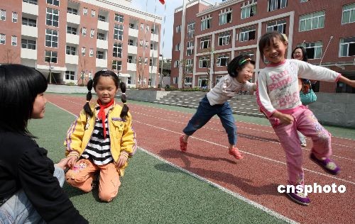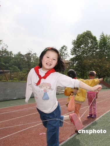 5月初,王彬與同學(xué)們開心地跳皮筋。梁平縣在“5·12”大地震中是重慶市受災(zāi)嚴(yán)重的地區(qū)。在教學(xué)樓垮塌后,王彬?yàn)榛厝ふ疫未能逃離的老師和同學(xué),不幸被垮落的水泥板“切”掉右臂。目前,王彬已能用左手熟練地自理生活和學(xué)習(xí),她說(shuō)最大愿望是將來(lái)參加殘奧會(huì)。中新社發(fā) 郭晉嘉 攝