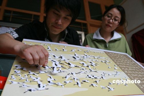 2009年5月7日,居住在北京東城區(qū)的姜文涵向人們展示剛剛完成的造型紙雕藝術(shù)——天堂之鳥千羽鶴。今年43歲的姜文涵來自黑龍江省海倫市。他從去年11月中旬開始,在妻子的協(xié)助下,用150多天的時間制作完成了999只丹頂鶴,分別鑲嵌在6個鏡框內(nèi),總長度512厘米。姜文涵想把這套作品送給汶川相關(guān)部門,以此紀(jì)念在5·12汶川大地震中不幸罹難的同胞。中新社發(fā) 陳曉根 攝