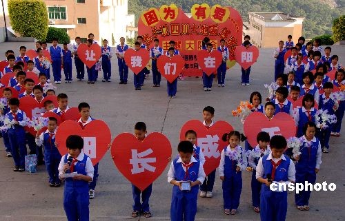 5月9日下午,35名來自四川地震災(zāi)區(qū)在福州一所國(guó)際學(xué)校就讀的小學(xué)生與同學(xué)們一起在該校舉行的“因?yàn)橛袗邸?悼念5.12四川大地震遇難者主題活動(dòng)中組成愛心圖案。當(dāng)日,福州陽光國(guó)際學(xué)校近千名師生在該校舉行“因?yàn)橛袗邸?悼念5.12四川大地震遇難者主題活動(dòng)。中新社發(fā) 劉可耕 攝