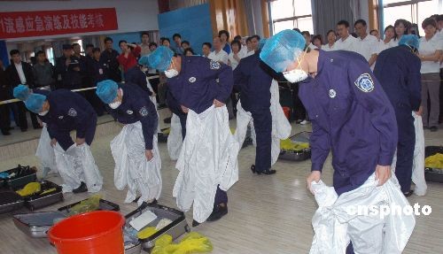 5月10日,針對(duì)當(dāng)前全球甲型H1N1流感疫情的嚴(yán)峻形勢(shì),河南省安陽(yáng)市疾病預(yù)防控制機(jī)構(gòu)開(kāi)展防控甲型H1N1流感應(yīng)急演練及技能考核活動(dòng);顒(dòng)旨在提高疾病防控工作人員的防控意識(shí),做到當(dāng)疫情真正來(lái)臨時(shí),能沉著冷靜面對(duì),迅速、及時(shí)、高效地做出反應(yīng)。 中新社發(fā) 常中正 攝