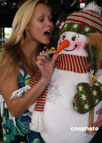 12月4日晚,正在廣東深圳參加第34屆國際比基尼小姐大賽的各國佳麗,來到灣區(qū)會館參加公益活動。圖為一名佳麗在會館布置的圣誕雪人前拍照。中新社發(fā) 錢興強 攝