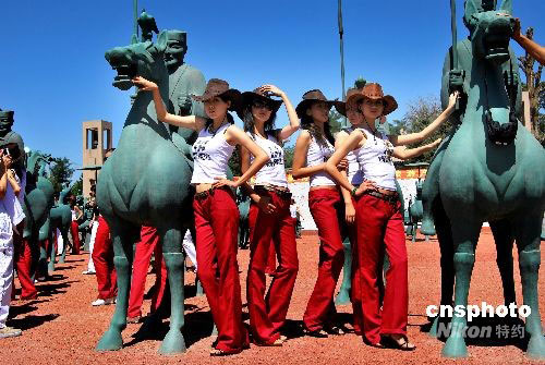 8月30日,第十屆敦煌國際服飾模特藝術(shù)節(jié)暨武威旅游產(chǎn)品發(fā)布會在我國旅游標志“馬踏飛燕”的出土地甘肅武威雷臺公園舉行。在發(fā)布會上,來自全國十多個省、市的40多名模特在雷臺景區(qū)進行了形象展示和旅游景點的推介,全國40家加媒體記者行了采訪拍攝。中新社發(fā) 孫煜東 攝