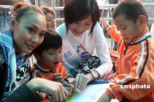 圖為來(lái)自臺(tái)灣的模特選手黃安潔在兒童福利院教兒童寫字。