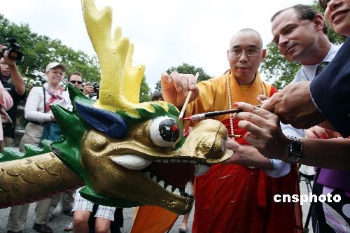 7月23日,美國紐約香港龍舟節(jié)主辦方在紐約中央公園舉行“點(diǎn)睛醒龍”儀式,宣布第十九屆香港龍舟節(jié)將于8月8日開幕,來自北美各地的一百五十多支隊(duì)伍將進(jìn)行兩天的角逐。主辦方當(dāng)日請(qǐng)來紐約云門寺的明予法師念誦經(jīng)文,給船身灑凈,并用毛筆蘸上紅顏料在船頭龍眼上“點(diǎn)睛醒龍”。中新社發(fā) 孫宇挺 攝