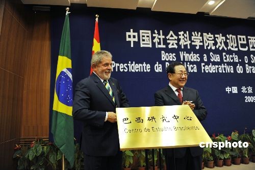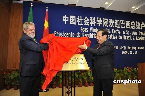 5月19日,正在對(duì)中國(guó)進(jìn)行國(guó)事訪問的巴西總統(tǒng)盧拉在中國(guó)社會(huì)科學(xué)院舉行演講,表達(dá)進(jìn)一步鞏固巴中戰(zhàn)略伙伴關(guān)系的信心。圖為巴西總統(tǒng)盧拉與全國(guó)政協(xié)副主席、中國(guó)社會(huì)科學(xué)院院長(zhǎng)陳奎元共同為巴西研究中心揭牌。中新社發(fā) 李學(xué)仕 攝