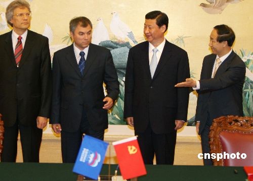 6月2日下午,中聯(lián)部部長王家瑞(右一)在北京人民大會堂與俄羅斯“統(tǒng)俄黨”總委會主席團(tuán)書記、俄羅斯國家杜馬副主席維·沃洛金(左二)簽署《中國共產(chǎn)黨與統(tǒng)一俄羅斯黨合作協(xié)議》、《中國共產(chǎn)黨與統(tǒng)一俄羅斯黨2009-2011年合作備忘錄》兩項(xiàng)協(xié)議。中共中央政治局常委、國家副主席習(xí)近平(右二)出席簽字儀式。中新社發(fā) 任晨鳴 攝