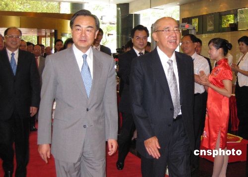 中國(guó)國(guó)民黨主席吳伯雄率參加第五屆兩岸經(jīng)貿(mào)文化論壇的中國(guó)國(guó)民黨代表團(tuán),7月10日下午乘臺(tái)北直飛的包機(jī)抵達(dá)湖南長(zhǎng)沙黃花機(jī)場(chǎng)。中共中央臺(tái)辦主任王毅等到機(jī)場(chǎng)歡迎。第五屆兩岸經(jīng)貿(mào)文化論壇將于7月11日至12日在長(zhǎng)沙舉行,論壇的主題是兩岸文教交流。中國(guó)國(guó)民黨、親民黨、新黨、無黨團(tuán)結(jié)聯(lián)盟、部分民進(jìn)黨人士,和眾多臺(tái)灣文化、教育、宗教屆和經(jīng)濟(jì)界代表與會(huì)。中新社發(fā) 傅煜 攝
