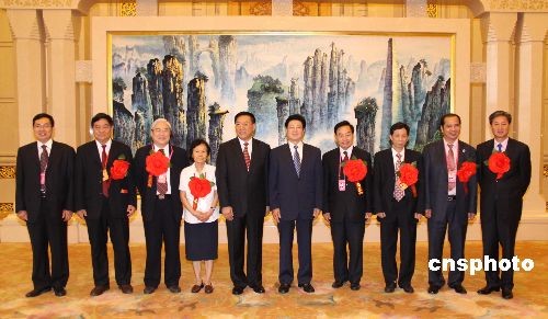 7月14日,全國“僑界十杰”在北京人民大會(huì)與全國人大常委會(huì)副委員長王兆國、中國僑聯(lián)主席林軍合影。當(dāng)日,全國“僑界十杰”評(píng)選產(chǎn)生,獲選的是:北京華騰東光科技發(fā)展有限公司高級(jí)工程師羅益鋒,吉林大學(xué)汽車學(xué)院教授郭孔輝,福建省光學(xué)技術(shù)研究所高級(jí)工程師賴愛光,中國科學(xué)院海洋研究所研究員鄭守儀,廣東韶關(guān)鋼鐵集團(tuán)有限公司主任工程師、高級(jí)技師羅東元,海南省農(nóng)墾總局副局長、南田農(nóng)場場長彭隆榮,中國科學(xué)院院士、世界著名數(shù)學(xué)家吳文俊,國家體育總局體操中心副主任、國家級(jí)教練黃玉斌,中國航空工業(yè)集團(tuán)公司北京航空材料研究院高級(jí)顧問顏鳴皋,神華集團(tuán)有限公司總經(jīng)理張玉卓。中新社發(fā) 史利 攝