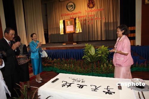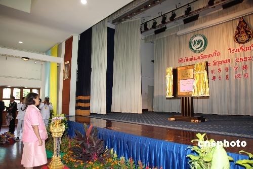 六月十二日的泰國吉拉達學校古老校園里洋溢著濃郁的中國文化氣息。在喧天的鑼鼓聲中,泰國瑪哈扎克里·詩琳通公主殿下按動電鈕,寫有“吉拉達學校孔子課堂”的牌匾徐徐拉開帷幕,標志著泰國第七家孔子課堂正式落戶這個坐落于泰國王宮里的學校。揭牌儀式上,詩琳通公主還興致勃勃地重酌墨水,揮毫為孔子課堂題寫了“學無止境 ”四個漢字,并勉勵泰國各孔子學院、孔子課堂擔當起推動泰國漢語教學進步、促進中泰友好關(guān)系發(fā)展的重任。中新社發(fā) 顧時宏 攝