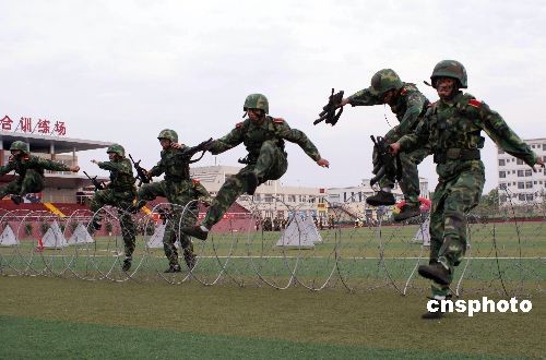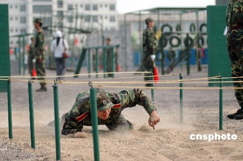 6月13日,山東聊城大學(xué)的441名國防生在校園綜合訓(xùn)練場表演軍體拳、進(jìn)攻戰(zhàn)術(shù)、渡海登島、心理素質(zhì)拓展等綜合素質(zhì)軍事技能,與濟(jì)南軍區(qū)簽訂依托培養(yǎng)國防生協(xié)議的山東大學(xué)、中國海洋大學(xué)、中國石油大學(xué)(華東)、山東理工大學(xué)、煙臺大學(xué)的代表及聊城大學(xué)師生進(jìn)行觀摩。中新社發(fā) 張振祥 攝