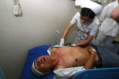 目擊于小龍被執(zhí)法人員毆打的小販林先生告訴記者,突然間4名身穿制服的執(zhí)法人員沖過來沒收東西。于小龍想從執(zhí)法人員手里搶回貨,卻換來一頓暴打。“滿臉都是血!绷窒壬f。記者在南城醫(yī)院看到于小龍?zhí)稍诖采仙胍,頭腦還比較清醒,稱打傷他頭部的是執(zhí)法人員手持的DV機。