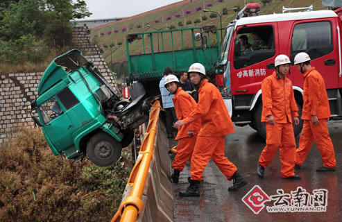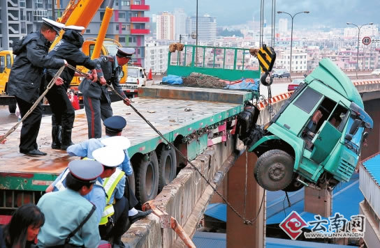 14日上午10時(shí)50分許,昆明市北二環(huán)通往黃土坡方向的小屯立交橋上層立交,上演了驚險(xiǎn)一幕:一輛行駛在立交橋上的大型拖掛車突然撞上立交橋護(hù)欄,沖出立交橋外,車頭“懸掛”在離地面30多米高的護(hù)欄外。事故還造成3人被困駕駛室,經(jīng)過消防人員施救,3人在這次事故中死里逃生。
