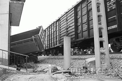昨(15)日凌晨5時過,一輛出城貨車途經(jīng)金牛區(qū)老沙西線西環(huán)線興盛鐵路道口時,與左邊飛馳而來的火車相撞,貨車駕駛員當(dāng)場死亡。是否由于當(dāng)晚道口值班人員失職,造成道路兩旁的欄桿沒有放下來,成為死者家屬質(zhì)疑的主要焦點(diǎn)。