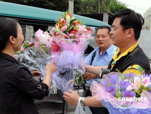5月27日傍晚,在福州定點場所解除醫(yī)學(xué)觀察后,兩名福建省首例輸入性甲型H1N1流感確診患兒同機接觸者接受親友(左一)贈送的鮮花。當(dāng)日,福建省衛(wèi)生廳在其網(wǎng)站上發(fā)布福建省甲型H1N1流感防控信息通報,截止5月26日24:00,衛(wèi)生部通報福建省首例輸入性甲型H1N1流感確診患兒病情進一步好轉(zhuǎn),無咳嗽及流涕,無并發(fā)癥,精神狀態(tài)良好,體溫正常,已連續(xù)3天體溫低于37℃。根據(jù)專家組的意見,該患兒同機的30名在閩密切接觸者隔離醫(yī)學(xué)觀察期限為5月27日20時。屆時密切接觸者如無特殊情況,即按期解除醫(yī)學(xué)觀察。患兒親屬及就診過程中的8名密切接觸者將按其與患兒脫離接觸的時間起算,隔離滿7日后,陸續(xù)解除醫(yī)學(xué)觀察。中新社發(fā) 劉可耕 攝