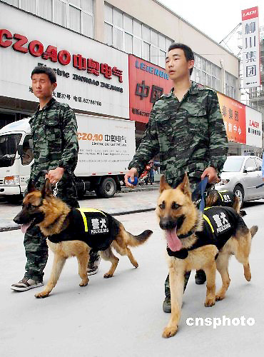近日,浙江溫州市樂清公安局首次將警犬投入到社會治安管理中。首批4條警犬分為兩組:一組負責(zé)樂清柳市車站周邊的巡邏,另一組配合警方設(shè)卡和對可疑人員的追蹤、圍堵。2009年4月份,樂清警方專門成立了警犬基地,由保安公司負責(zé)飼養(yǎng)與日常管理。目前,警犬基地已從南京軍區(qū)購買20只警犬,每只身價都在萬元以上,多為體型強壯勻稱、勇敢無畏的德國牧羊犬。據(jù)介紹,這20只護衛(wèi)犬主要用于溫州樂清的警戒、巡邏等,其中4只首批受訓(xùn)成功投入使用。中新社發(fā) 許勛磊 攝